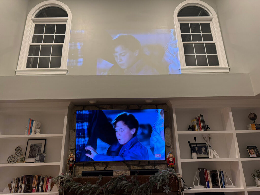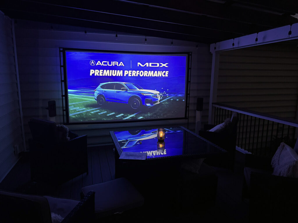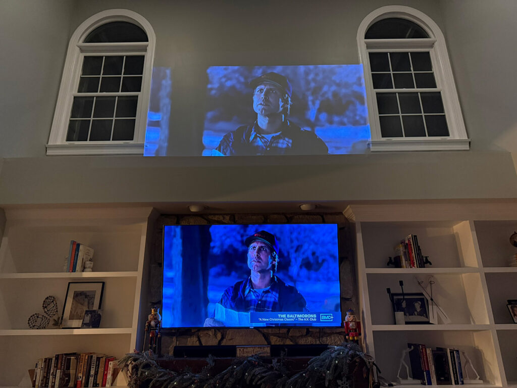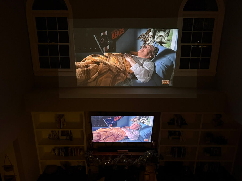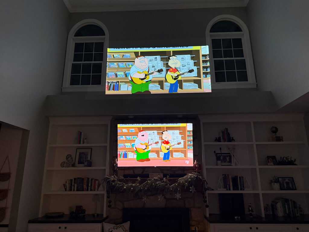 Whether it’s a backyard screening where patio lights are still on, or a living room with curtains drawn but some ambient glow, the image stays punchy and vibrant. No squint-and-adjust needed.
